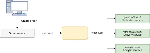 - Event Consumer, komponen penerima pesan yang dikirim oleh message broker, kemudian memprosesnya sesuai dengan instruksi dalam pesan yang diterima.