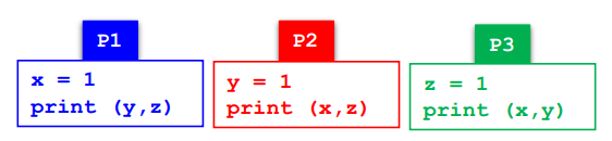 Perhatikan tiga proses P1, P2 dan P3 yang mengeksekusi banyak instruksi pada tiga shared variables x, y dan z. Anggap bahwa x, y dan z dimulai dengan nilai nol :